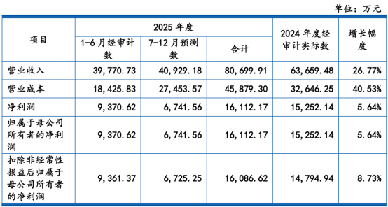 公司预计2025年营业收入为80,699.91万元,同比增长26.77%;归属于母公司股东净利润为16,112.18万元,同比增长5.64%;扣除非经常性损益后归属于母公司股东的净利润为16,086.62万元,同比增长8.73%。