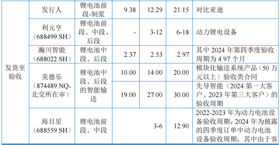 验收周期口径为发货至验收的案例中, 美德乐 的验收周期情况与公司对 比亚迪 的验收周期基本一致。由于锂电前段设备主要用于过程控制,其工况相对复杂,需要较长时间验证其稳定性及适应能力,因此验收周期较长,如发行人、理奇智能等;锂电中后段设备以自动化设备为主,主要通过精密控制完成往复动作,可复制性强,验证速度快,验收周期较短,如 海目星 、 逸飞激光 等,锂电中后段设备中的标准化单机设备验收周期更短,如 瀚川智能 验收周期仅为2-4个月。