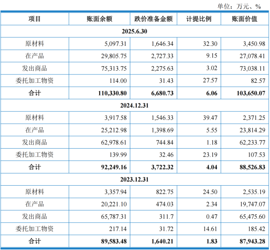 其中,2024年末、2025年6月末的存货跌价准备金额和计提比例较前两年增加较多,主要是原材料、在产品和发出商品的跌价准备计提增加较多所致。