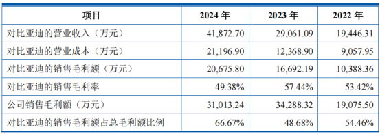 报告期内,公司对前五大客户的销售金额占当期营业收入的比例分别为91.48%、91.76%、89.86%和93.65%,其中对 比亚迪 的销售金额占比分别为49.04%、48.39%、65.78%和36.29%,对应的销售毛利占比分别为54.48%、48.70%、66.67%和33.80%,公司对 比亚迪 构成重大依赖,同时 比亚迪 持有公司超过5%的股份,构成公司关联方,双方之间的交易构成关联交易。
