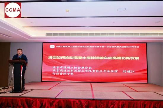 北京市混凝土协会原会长、北京城建亚东混凝土有限责任公司总经理刘建江作《浅谈如何推动混凝土搅拌运输车向高端化新发展》主题报告