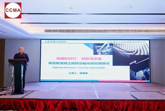 山东精砼工程机械股份有限公司董事长、协会专家委员会委员盛富春作《高端砼时代向新谋发展——高性能混凝土搅拌运输车的实现探讨》主题报告