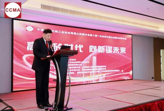 符忠轩作《十年精进,再接再厉,奋力谱写混凝土机械高质量发展新篇章》主题报告。他在报告中回顾总结了过去十年混凝土机械分会所取得的工作成绩。十年来,分会精准定位,努力打造成为全产业链、行业上下游紧密联动的行业协会;坚持“标准引领,高质量发展”的工作思路,围绕“数智、安全、低碳”重点方向,组织开展13项混凝土机械相关团体标准的制定和发布,积极参与行业相关11项国家标准和3项行业标准的推广宣贯;发挥桥梁纽带作用,广泛走访会员企业,倾听企业诉求,针对多项行业痛点、难点与卡点问题,向国家有关部门提出解决的政策性意见和建议。