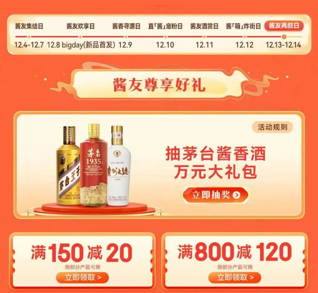本次活动不仅推出了包含多款产品的“万元大礼包”抽奖、阶梯式满减优惠,还设置了“19.35元抢茅台1935”、“9.9元抢金王子”等每日限量抢购活动,既降低了消费者的尝鲜门槛,也充分激活了市场热度。