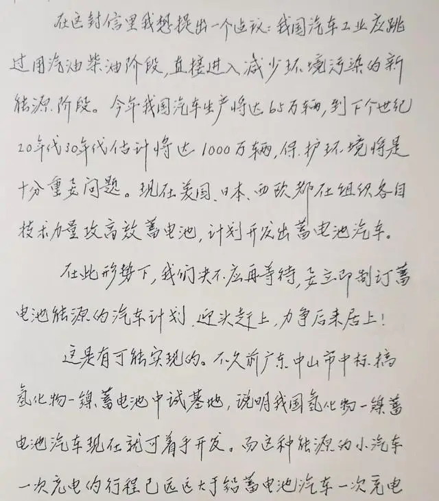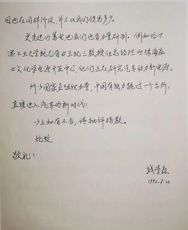 1992年8月22日,钱学森写信给邹家华,建议中国汽车工业直接跳过汽油柴油阶段,转向蓄电池动力,减少环境污染。信里分析氢化物镍蓄电池现状,指出一次充电能跑250到300公里,已有实用潜力。