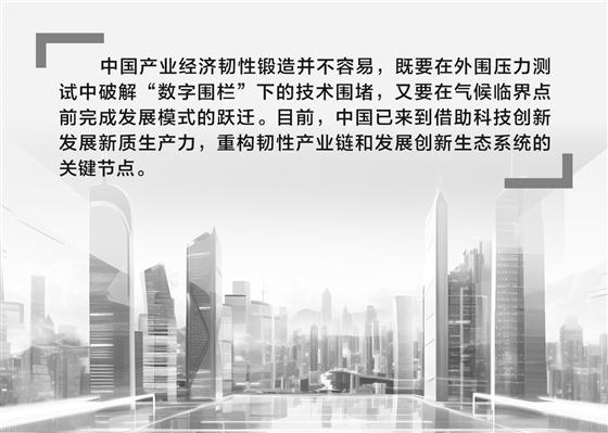 “中国产业经济韧性锻造并不容易,既要在外围压力测试中破解‘数字围栏’下的技术围堵,又要在气候临界点前完成发展模式的跃迁。目前,中国已来到借助科技创新发展新质生产力,重构韧性产业链和发展创新生态系统的关键节点。”盘古智库相关人士表示。