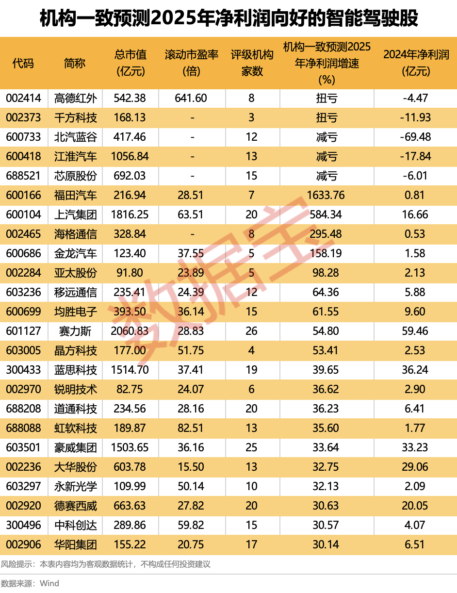根据3家及以上机构一致预测,在2024年同期盈利的基础上,2025全年净利润增速有望超过30%的智能驾驶股共计19只。 福田汽车 、 上汽集团 、 海格通信 、 金龙汽车 净利润增长翻倍,同比增速依次为1633.76%、584.34%、295.48%、158.19%。此外, 高德红外 、 千方科技 等则有望扭亏为盈。