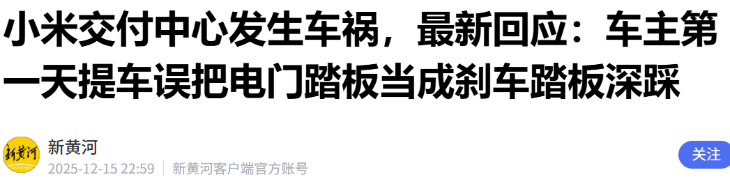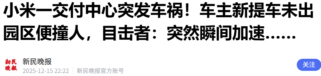 12月16日,据多交媒体报道,浙江杭州 小米 下沙交付中心发生一起交通事故。一名首日提车的 小米 车主在尚未驶离园区的情况下,在倒车过程中误将电门踏板当作刹车踏板深踩,碰撞到侧边一名蹲在墙角的销售人员。