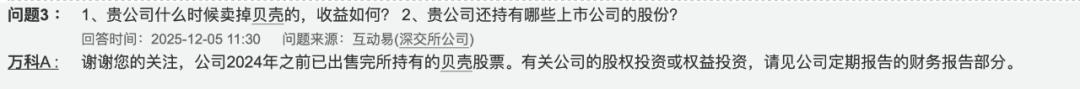 万科 董秘称2024年公司已经出售贝壳股票资产;对于出售 徽商银行 7%股权, 万科 董秘没有正面回应。