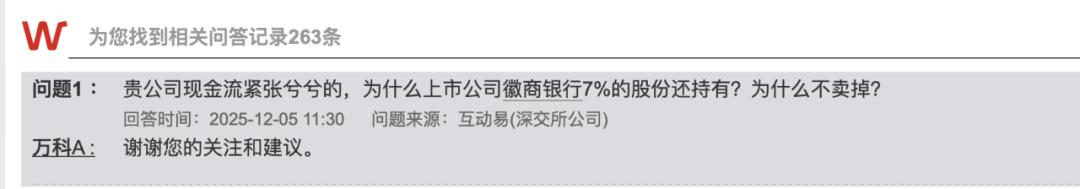 万科股民“怒问”:为何不卖徽商银行股权等资产偿债?董秘这样回答