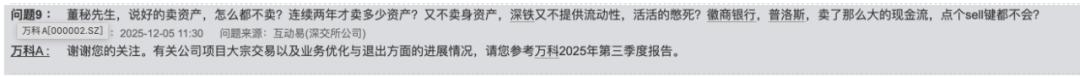 由于 万科 多项债务到期展期,投资者关注到 万科 的资产和偿债计划。近日,多位投资者在互动平台提问,建议 万科 出售手上的股权资产。对此, 万科 董秘分别进行回应。