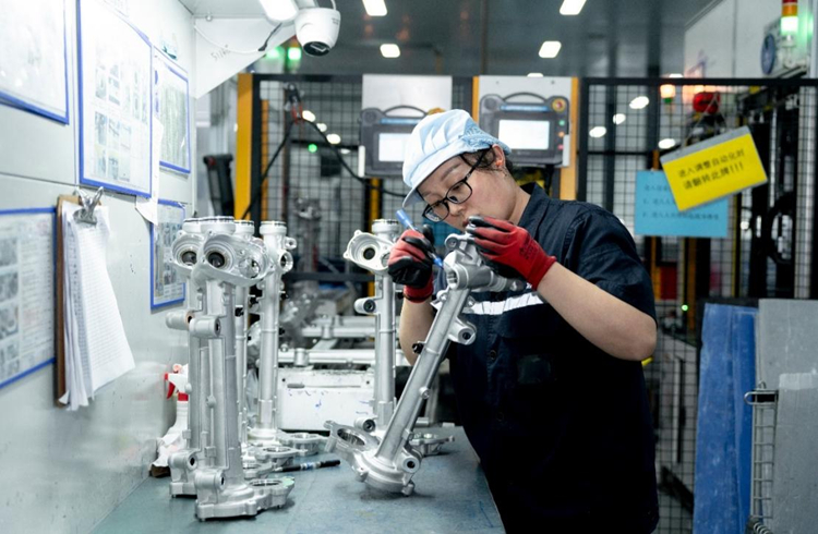 江苏纽泰格科技集团有限公司,女工正在检测产品。淮安市委网信办供图