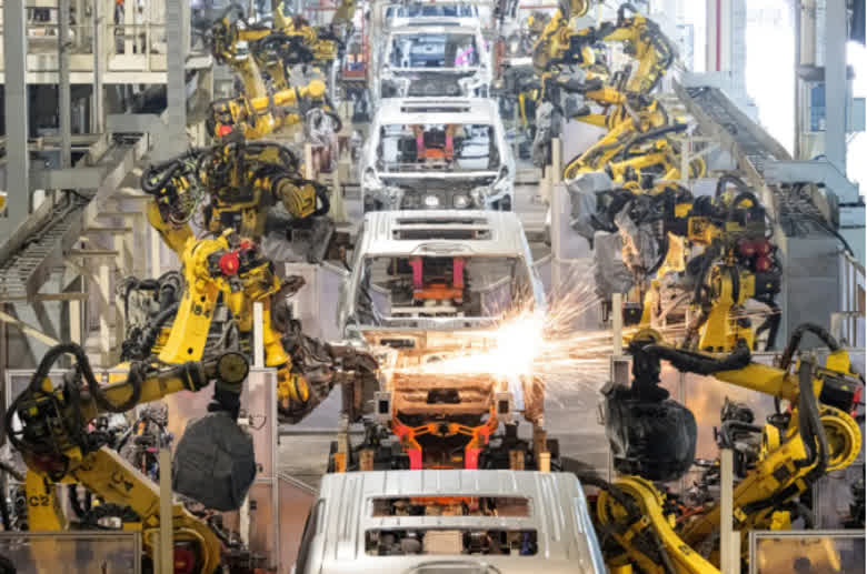 岚图智能智造工厂焊装车间,焊接机器人在生产线上焊接车身(任勇|摄)