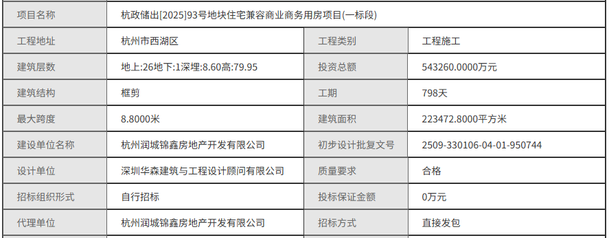 项目名称:杭政储出[2025]93号地块住宅兼容商业商务用房项目中标公示