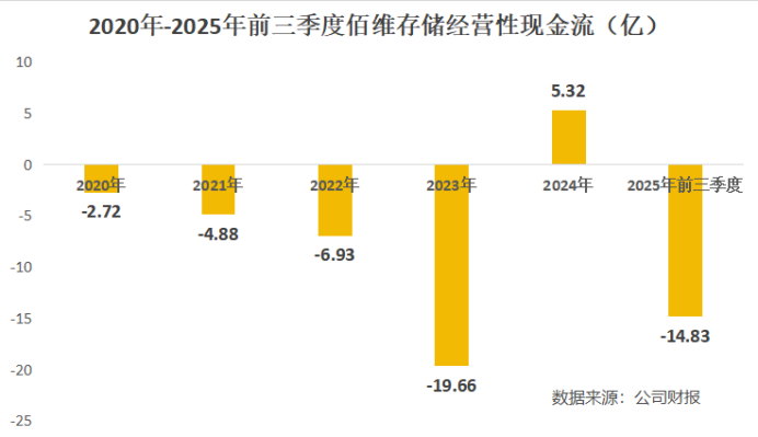 一个更严峻的问题是经营性现金流。2025年前三季度,佰维存储经营现金流净额为-14.83亿元。而且这不是偶然,其现金流常年为负。
