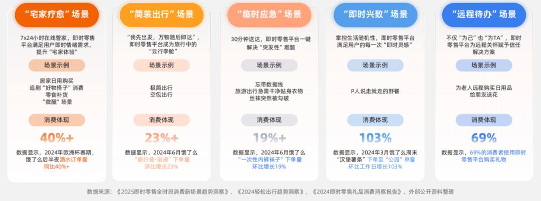 即时零售的重点消费场景正不断拓展与深化,“宅家疗愈”(如与“好物搭子”共享购物乐趣)、“简装出行”(如轻装旅行、即兴采购)、“即时兴致”(如一场说走就走的野餐)以及“远程待办”(如为异地家人远程购买日用品)等,均成为驱动增长的关键情境。