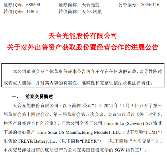去年11月, 天合光能 发布对外出售资产获取股份暨经营合作的公告,拟将位于得克萨斯州威尔默的5GW组件工厂出售给美国上市公司 FREYR(NYSE: FREY),除了现金等对价, 天合光能 还将获得 FREYR部分股权。值得注意的这家工厂在出售前几日刚刚才实现投产。