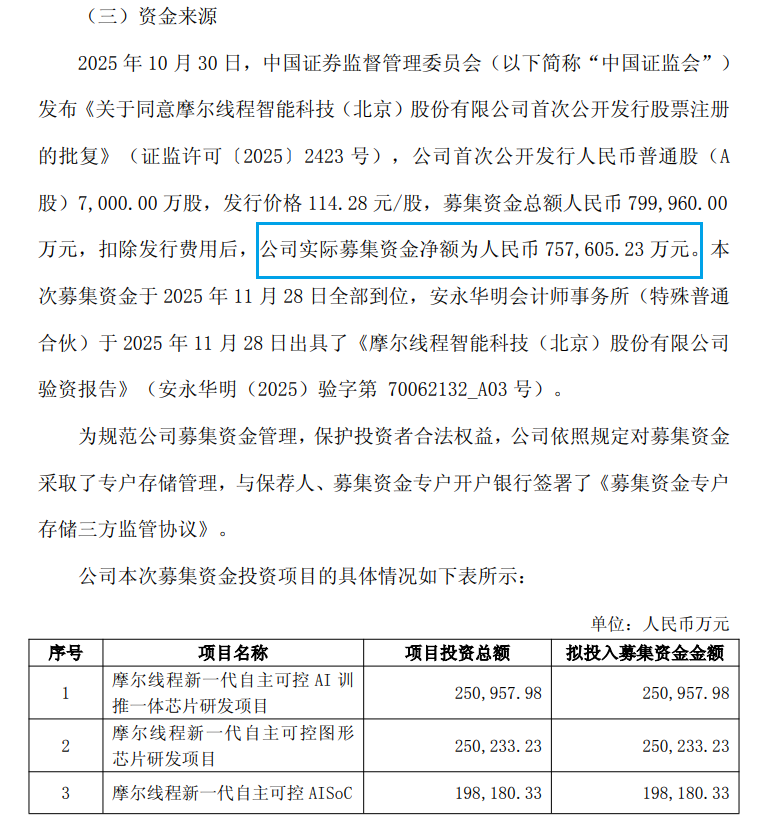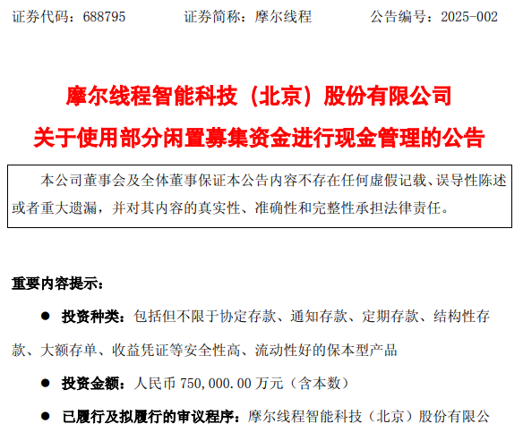 只是在摩尔线程登陆科创板仅6个交易日后,摩尔线程就发公告称使用75亿元闲置募集资金进行现金管理,值得注意的是,摩尔线程实际募集资金净额也不过75.76亿元。