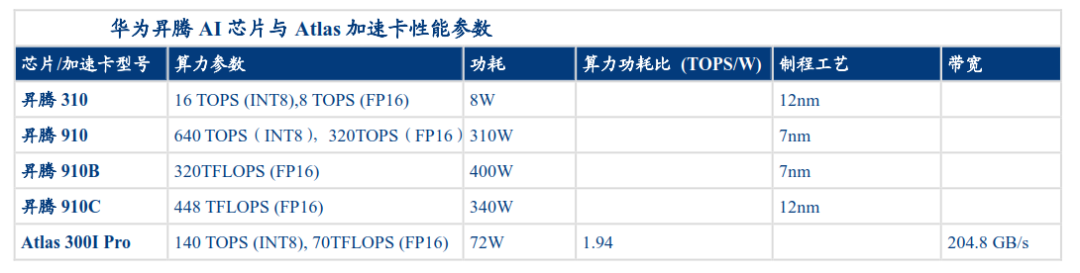 以华为昇腾910C为例,该产品用7nm+EUV工艺,将FP16算力推至448TFLOPS,并较910B功耗再降15%;而且910C采用Chiplet双芯封装,1024芯片集群FP16算力达819.2PFLOPS,可对标NVIDIA H100集群,支撑千亿参数模型训练。
