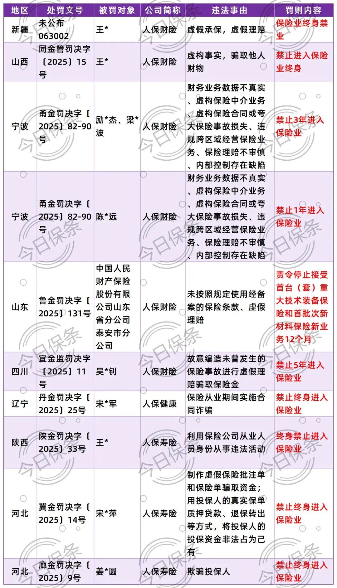 从顶格罚单看,6人被终身禁业,1人禁业1年,2人被禁业3年,1人被禁业5年。山东省分公司泰安市分公司责令停止接受首台(套)重大技术装备保险和首批次新材料保险新业务12个月。