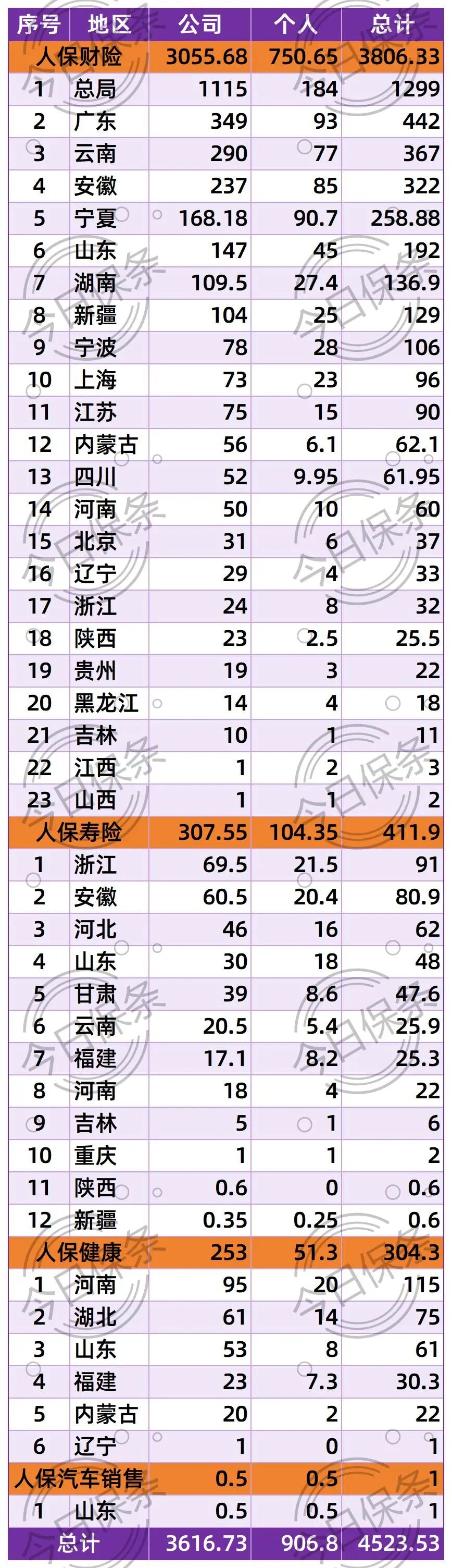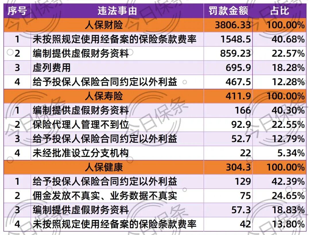 其中: 人保财险 罚单金额3806.33万元,涉及总局、广东、云南等23个监管辖区。 人保寿险 罚单金额411.9万元,涉及浙江、安徽、河北等12个监管辖区; 人保健康 罚单金额304.3万元,涉及河南、湖北、山东等6个监管辖区。