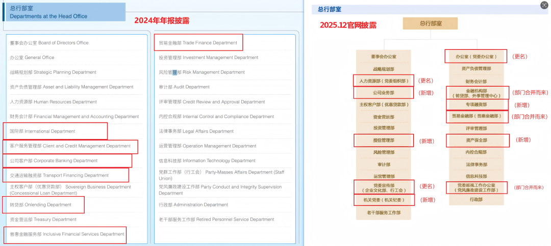 年内总行部室架构大幅调整,新设国际部、公司客户部等八部门  《今日行长》注意到,高管团队趋于满编同时,口行于年内大幅调整总行部室架构,相较于年初财报,现已撤除五部门,新增五部门,合并新设三部门,更名三部门,具体来看——  撤销部门有,国际部、客户服务管理部、公司客户部、交通运输融资部;  新增部门有,公司业务部、授信管理部、专项融资部、资产保全部、机关党委(机关纪委);  合并新设部门有,转贷部与外事管理中心合并构成新部门——金融机构部,普惠金融部被合并进贸易金融部,党风廉政建设工作部被合并进入党委巡视工作办公室;  更名部门有,办公室更名办公室(党委办公室),人力资源部更名人力资源部(党委机构部),党群工作部(行工会)更名党委宣传部(企业文化部、行工会)。