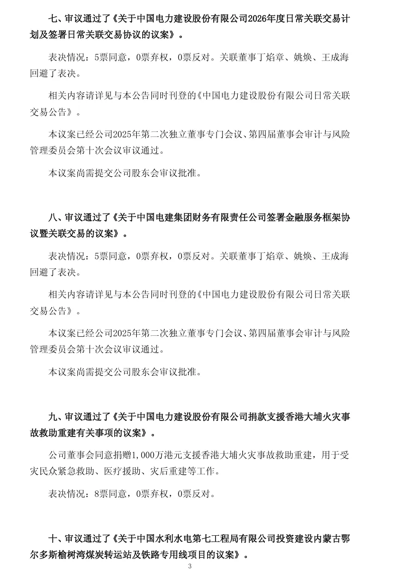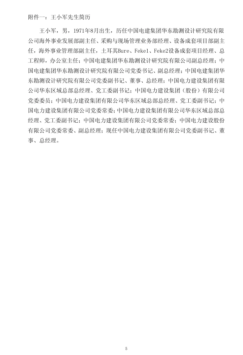 会议审议通过了《关于确定中国电力建设股份有限公司第四届董事会董事候选人的议案》。经公司控股股东中国电力建设集团有限公司提名、公司董事会人事薪酬与考核委员会审核,公司董事会同意推举王小军先生为公司第四届董事会董事候选人,任期与第四届董事会其他董事任期一致。