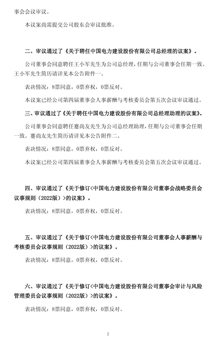 会议审议通过了《关于聘任中国电力建设股份有限公司总经理的议案》。公司董事会同意聘任王小军先生为公司总经理,任期与公司董事会任期一致。