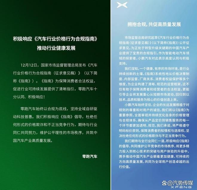 零跑 汽车表示坚守合规底线,践行公平竞争,与行业同仁共筑健康生态,推动中国汽车产业高质量发展。 小鹏汽车 则以《指南》为重要参照,全面审视并持续优化自身的价格管理与合规体系,确保从产品定价到销售服务的每一个环节都更加透明、规范。我们承诺,将严格遵守明码标价原则,保障消费者的知情权与选择权,坚决杜绝任何形式的价格欺诈与不正当竞争行为。