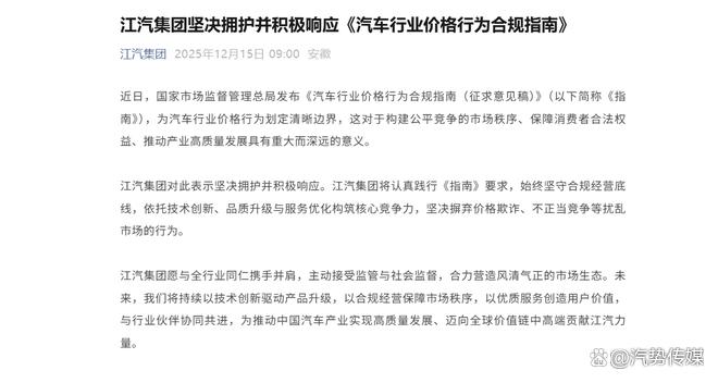 江汽集团 对此表示坚决拥护并积极响应。 江汽集团 称,将认真践行《指南》要求,始终坚守合规经营底线,依托技术创新、品质升级与服务优化构筑核心竞争力,坚决摒弃价格欺诈、不正当竞争等扰乱市场的行为。主动接受监管与社会监督,合力营造风清气正的市场生态。