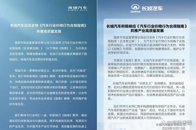 长城汽车 则表示积极响应《指南》要求,严守合规底线,坚持明码标价,杜绝价格欺诈,以长期主义和诚信经营推动行业健康有序发展。持续加大研发投入,以技术创新驱动产品价值提升,为消费者提供高品质产品与服务。