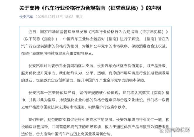 长安汽车 表示将认真落实《指南》精神,持续强化企业内部的价格合规意识与合规文化建设,一以贯之地严格遵守国家法律法规与市场规则。