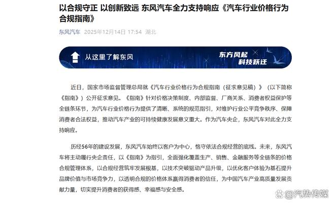 东风汽车 通过官方公众号发布声明表示:历经56年的建设发展, 东风汽车 始终以客户为中心,恪守依法合规经营的底线。未来, 东风汽车 将主动履行央企责任,以《指南》为指引,全面强化覆盖生产、销售、金融服务等全链条的价格合规管理体系,以合规经营筑牢发展根基,以技术突破驱动产品升级,以优化客户体验为基石提升品牌价值与市场竞争力,以透明合规的价格体系赢得消费者的信任。