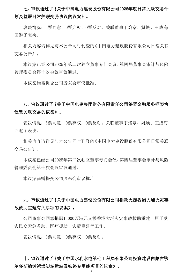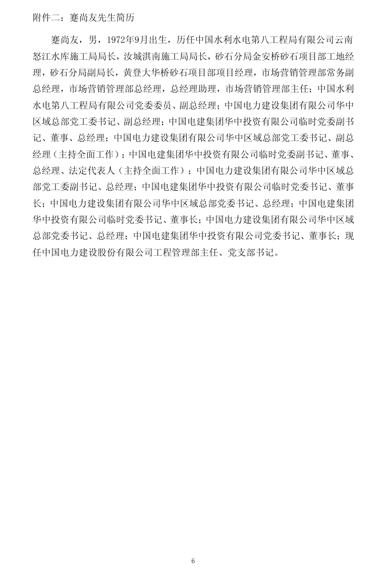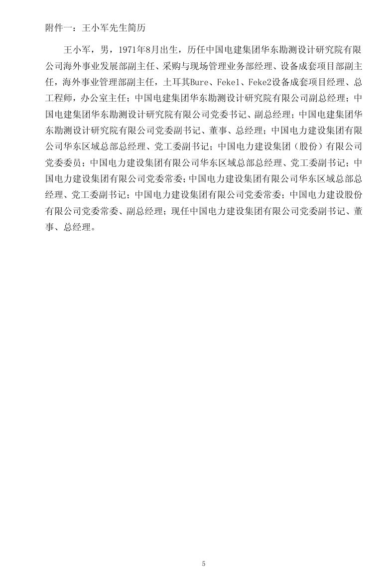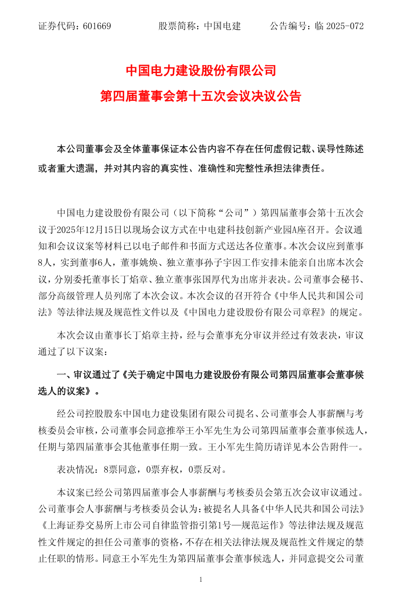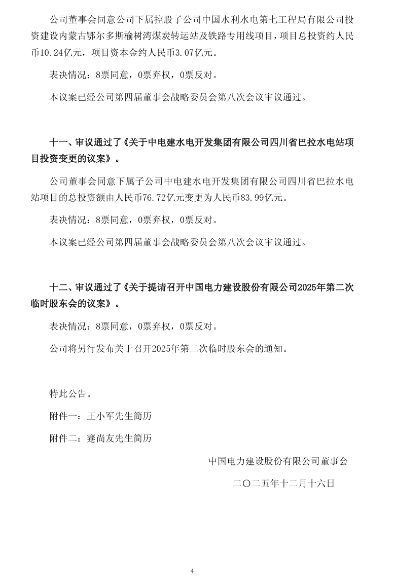 会议审议通过了《关于确定中国电力建设股份有限公司第四届董事会董事候选人的议案》。经公司控股股东中国电力建设集团有限公司提名、公司董事会人事薪酬与考核委员会审核,公司董事会同意推举王小军先生为公司第四届董事会董事候选人,任期与第四届董事会其他董事任期一致。