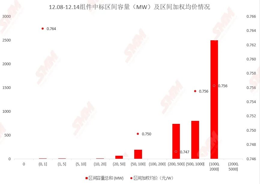 经SMM分析,当前统计区间光伏组件中标价格主要集中于区间0.75~0.76元/瓦。当前统计区间加权均价为0.76元/瓦,相较上一统计区间(0.74元/瓦)上升0.02元/瓦,原因为受到主要中标容量区间加权均价的影响:在披露价格的区间中,容量占比最大区间为1000MW-2000MW,该区间占比57.83%,区间均价为0.756元/瓦,其次为500-1000MW,该区间占比18.51%,区间均价为0.756元/瓦。因此当前统计区间均价有所上升。