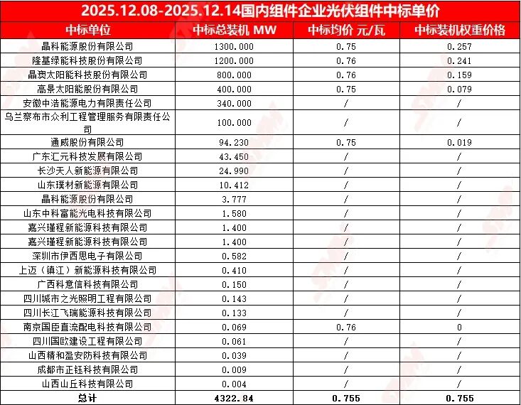 2025年12月8日至2025年12月14日,当前统计区间SMM统计国内中标:晶科能源股份有限公司,隆基绿能科技股份有限公司,晶澳太阳能科技股份有限公司,高景太阳能股份有限公司,安徽中浩能源电力有限责任公司,乌兰察布市众利工程管理服务有限责任公司,通威股份有限公司等共 38 项,数据处理后,披露装机容量项目共24项,披露中标装机价格项目共6项,当前统计区间采购定标组件型号主要为N型组件。