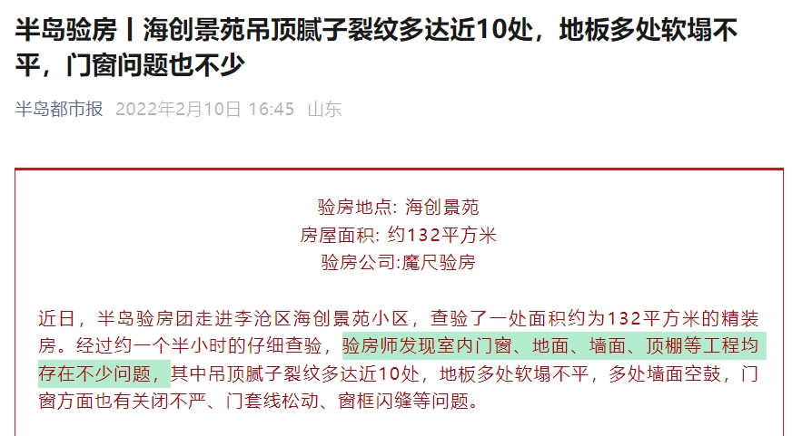 然而,此前青岛当地的纸媒《半岛都市报》就曾报道曾有验房师发现该项目某户型室内门窗、地面、墙面、顶棚等工程均存在不少问题;此后项目工作人员也回应此现象属于个别问题,并针对问题将启动相关维修。