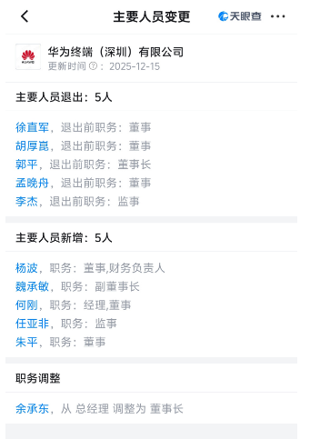据 天眼查 ,近日, 华为 终端(深圳)有限公司、 华为 终端有限公司双双发生工商变更,董事长均变更为余承东,法定代表人都变更为魏承敏。同时还有多位高管发生变更。