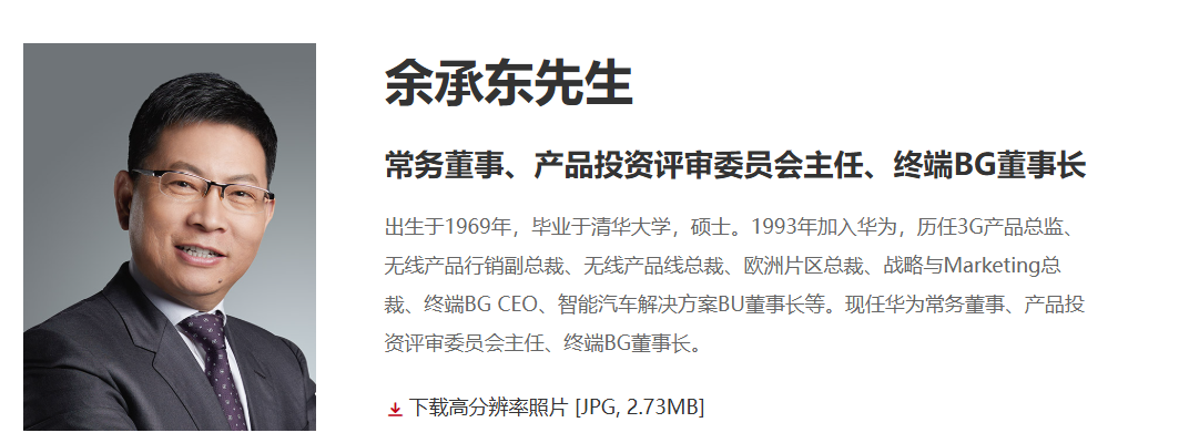 华为 官网披露的管理层信息显示,当前余承东的职务是 华为 常务董事、产品投资评审委员会主任、终端BG董事长。