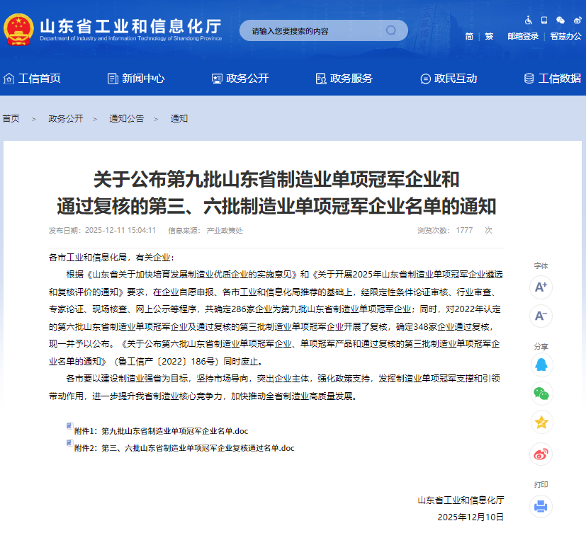 通知称,根据《山东省关于加快培育发展制造业优质企业的实施意见》和《关于开展2025年山东省制造业单项冠军企业遴选和复核评价的通知》要求,在企业自愿申报、各市工业和信息化局推荐的基础上,经限定性条件论证审核、行业审查、专家论证、现场核查、网上公示等程序,共确定286家企业为第九批山东省制造业单项冠军企业;同时,对2022年认定的第六批山东省制造业单项冠军企业及通过复核的第三批制造业单项冠军企业开展了复核,确定348家企业通过复核,现一并予以公布。《关于公布第六批山东省制造业单项冠军企业、单项冠军产品和通过复核的第三批制造业单项冠军企业名单的通知》(鲁工信产〔2022〕186号)同时废止。