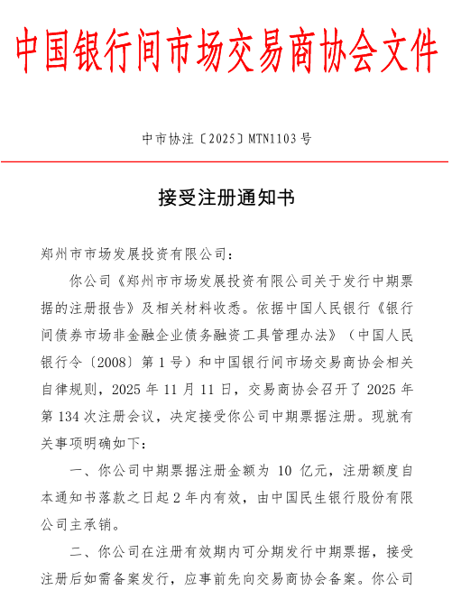 【大河财立方消息】12月16日,银行间交易商协会公告,接受郑州市市场发展投资有限公司中期票据注册,金额为10亿元,注册额度自2025年11月18日起2年内有效,由中国民生银行股份有限公司主承销。