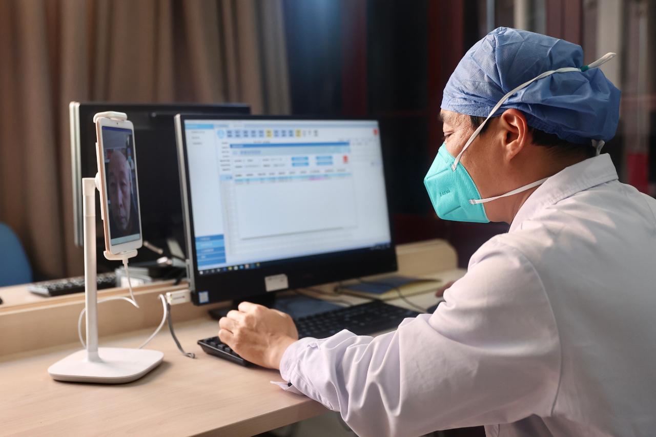 图为在 首都医科大学附属北京朝阳医院 本部,医生正在通过互联网医院为患者进行在线诊疗。(图片由CNSPHOTO提供)