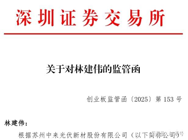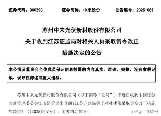 短短三天后的12月15日, 中来股份 发布公告——  苏州中来光伏新材股份有限公司(以下简称“公司”)于近日收到 中国证券监督管理委员会 江苏监管局出具的《江苏证监局关于对林建伟采取责令改正措施的决定》([2025]207号)。