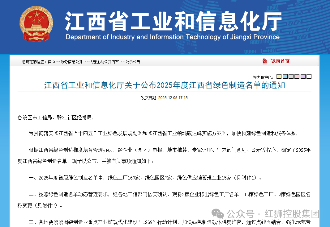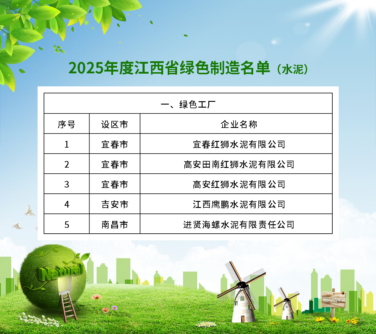 近日,江西省工业和信息化厅正式公布2025年度省级绿色制造名单,共有5家水泥企业入选,其中红狮集团4家,分别是高安红狮水泥有限公司、宜春红狮水泥有限公司、高安田南红狮水泥有限公司和江西鹰鹏水泥有限公司。
