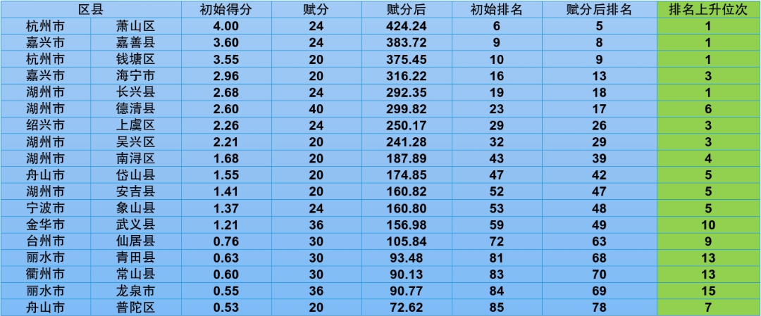 “X”项特色指标发挥关键作用,助力4县提档进位。22县中有5个县(市、区)有“X”项赋分,其中武义县和龙泉市X项赋分36分,常山县、仙居县和青田县“X”项赋分30分。与赋分前相比,除武义县稳居第一,位次未发生变化以外,其余4个县(市、区)在22县排名中均实现位次提升。其中,仙居县上升4位至第二位,通过整合高校院所资源,构建医疗器械成果池,配套设立10亿元规模医械科技成果转化基金,已累计投资20个成果项目,撬动社会资本投资5亿元,为科技成果快速落地仙居提供有力支撑;青田县上升10位至第四位,青田特种金属材料成果池入选浙江省第二批“先用后转”成果池名单,在打通科研与产业“最后一公里”上迈出坚实一步。