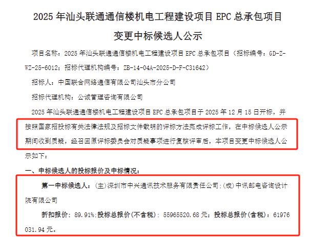 近日,中国联通某地市公司几千万的机电工程建设项目变更中标候选人,具体是什么情况?