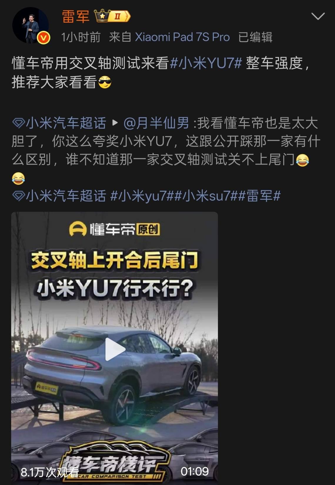 因此,其小米 YU7 的表现优异完全符合工程逻辑,但这并不代表其他车型就存在设计缺陷,更不应由此将「交叉轴关门」与「车辆安全性」强行挂钩,认为「连门都关不上,这车撞起来肯定不安全」。