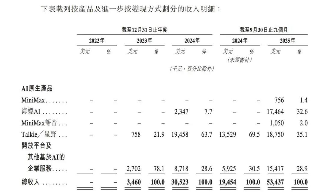 MiniMax AI原生产品营收情况,图/MiniMax招股书