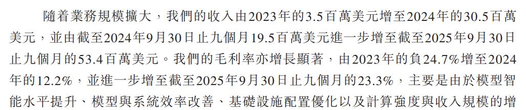 更关键的“底线指标——毛利率,反映出其成本控制能力的提升。MiniMax披露,MiniMax毛利率由2023年的-24.7%,扭转为2024年的12.2%,升至截至2025年前三季度23.3%,呈现出持续改善的趋势。