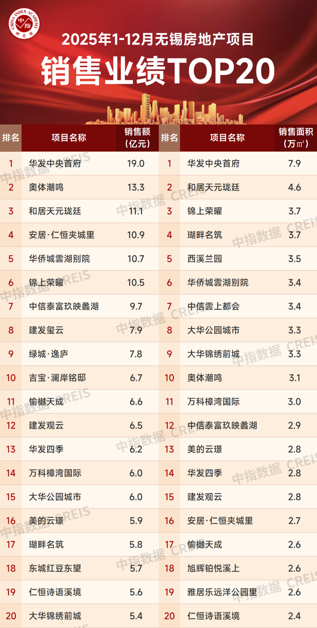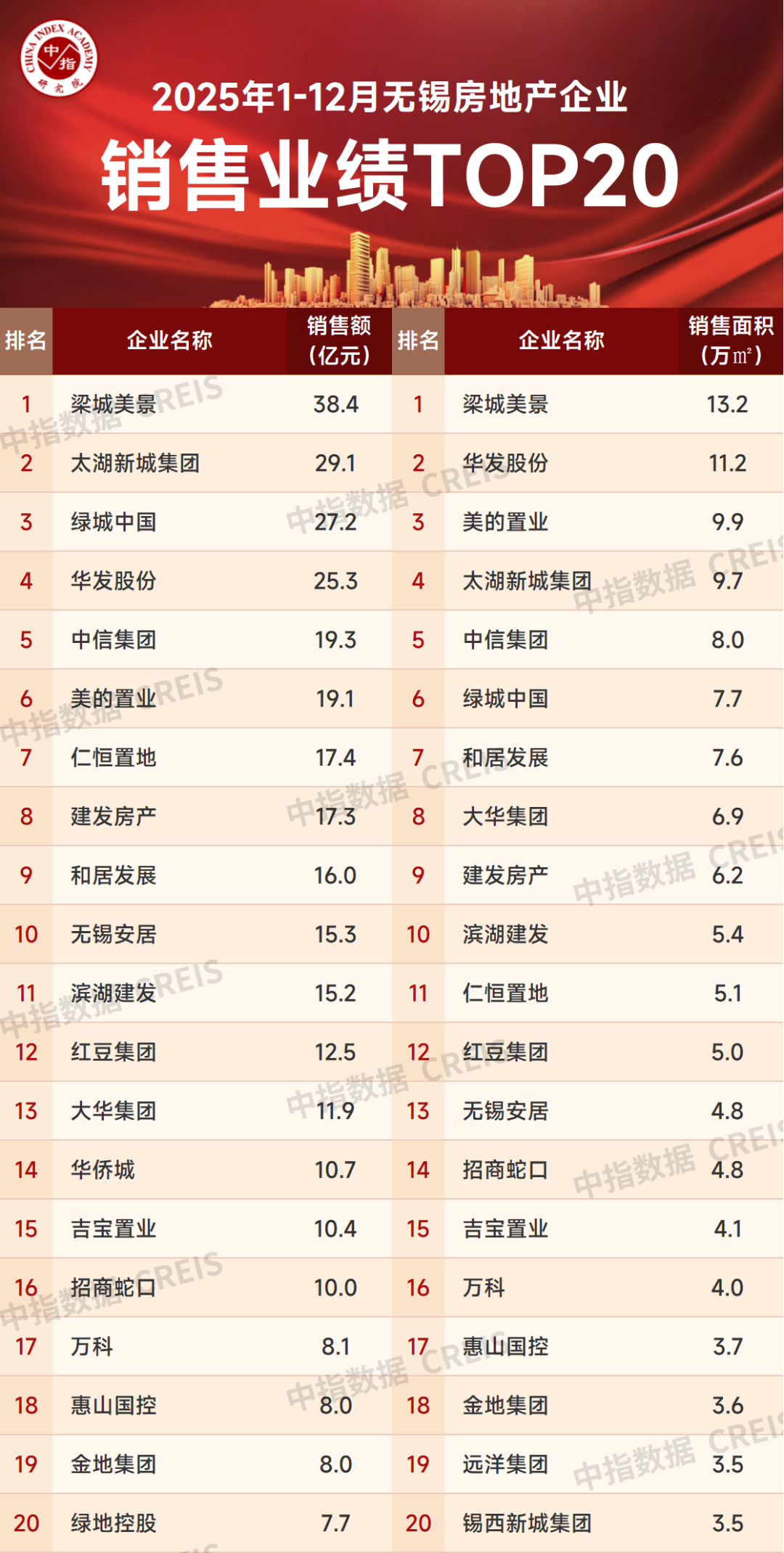 特别声明:房地产企业销售数据统计是以2025年1月1日-12月28日期间销售的商品房为统计口径,主要依据中指数据CREIS(点击查看)在无锡市区(不含江阴、宜兴)的销售监测数据,并参考当期总体经营情况和推盘去化情况进行分析统计;对于少数没有在监测范围内的项目,由企业提供相关证明文件,经课题组对数据进行严格审核,也纳入统计范围。本报告仅供参考,课题组不对使用报告及其内容所引发的任何直接或间接损失承担责任。